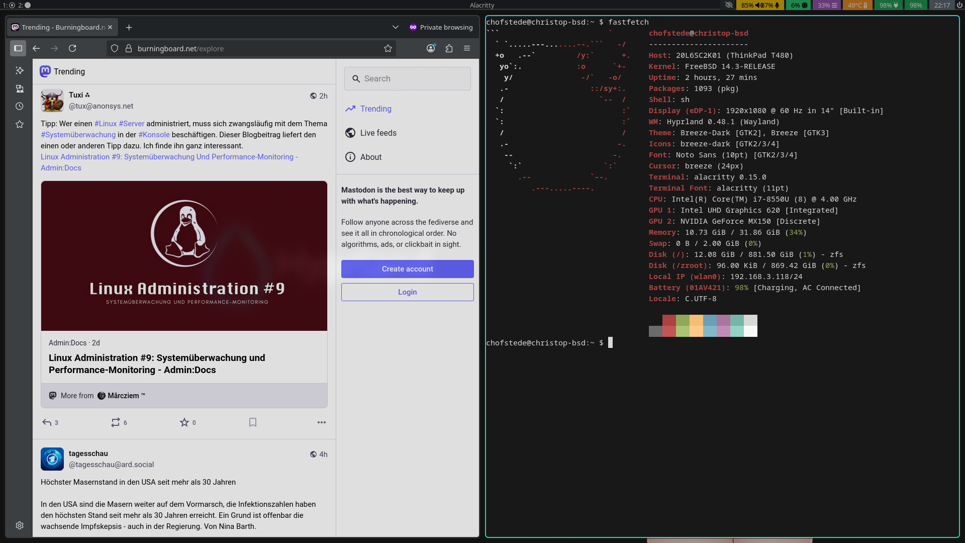 Wir haben für unsere Mastodon Instanz burningboard.net eine kleine Homepage gebaut, in der ein bisschen das Fediverse und Mastodon erklärt werden, die Regeln erläutert werden und News veröffentlicht werden:
