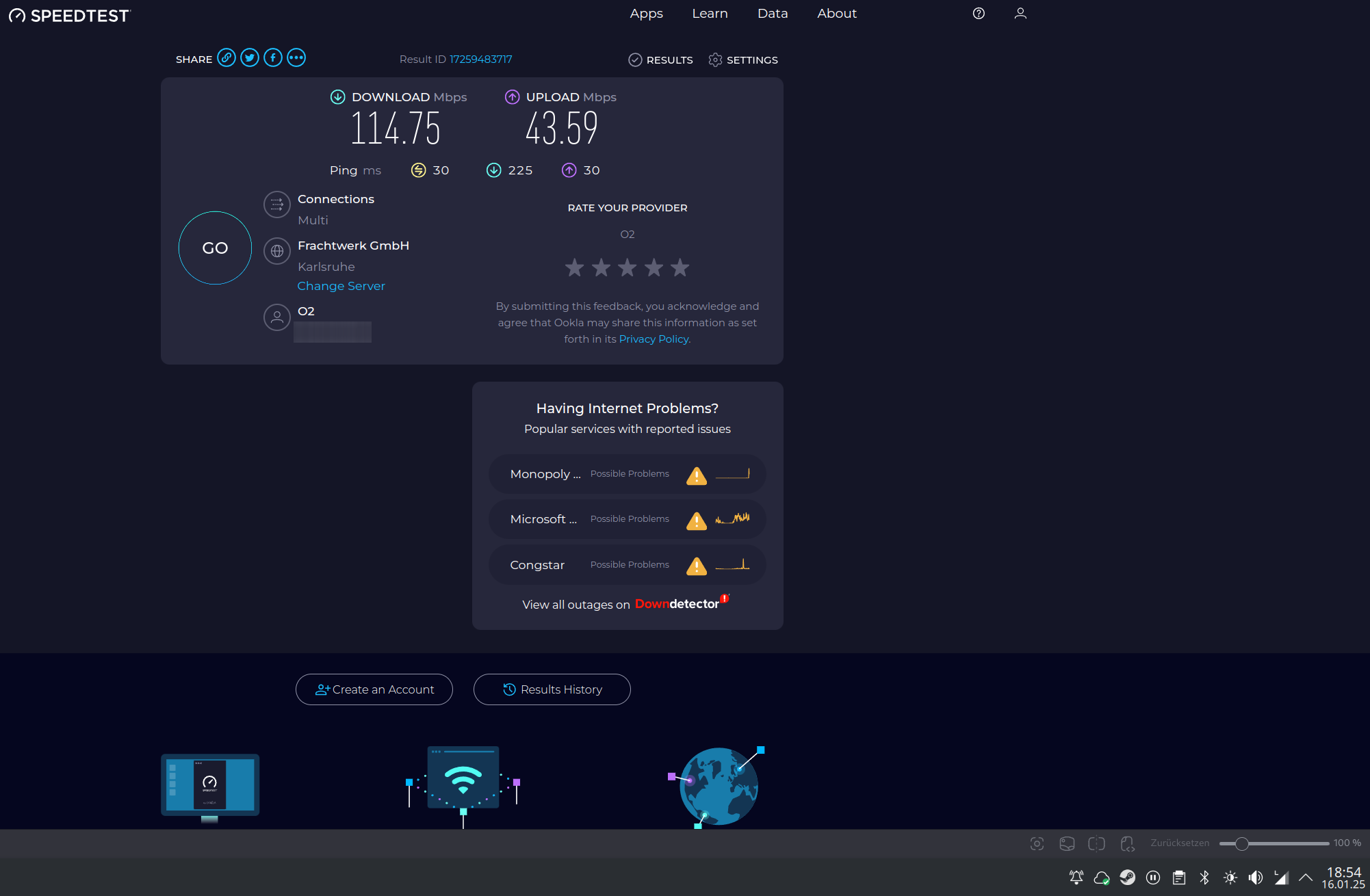 Speedtest from my Lenovo T14s Gen4 with the integrated Intel XMM7560 LTE modem under Linux on the AldiTalk/O2 network.