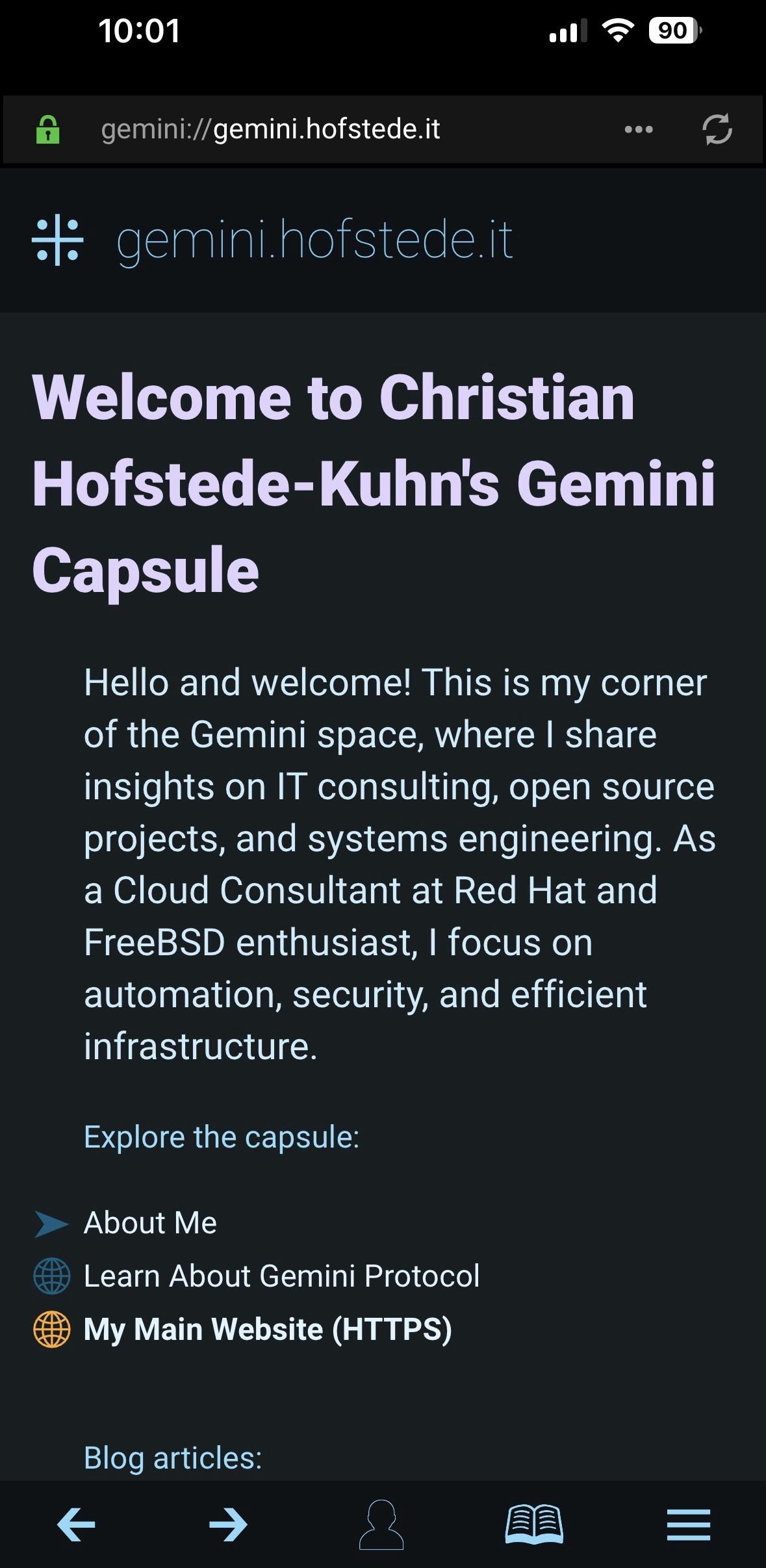 I write about FreeBSD and self-hosting at gemini://gemini.hofstede.it/