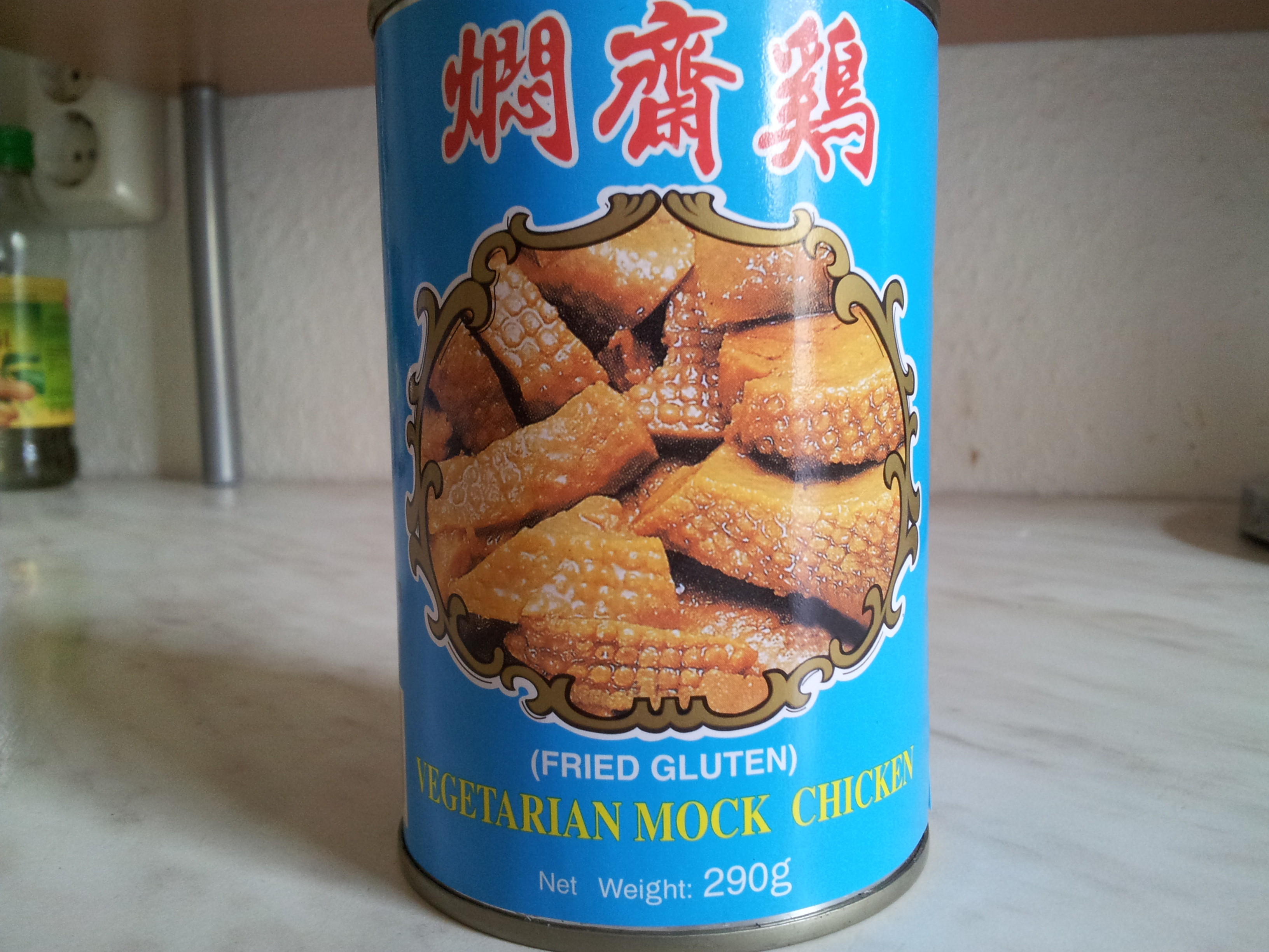 Heute: Gebratene Nudeln mit Gemüse und chinesischem "Mock chicken" aus der Dose (Süchtig machendes "Hühnchen" aus Weizenprotein).