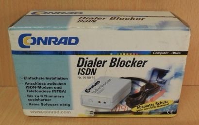 Dialer Blocker, den man zwischen Computer und das Telefonnetz geklemmt hat, um zu verhindern, dass eine bestimmte Art von Schadsoftware (die Dialer) teuere Mehrwertnummern anwählen und horrende Kosten auf der Telefonrechnung verursachen.