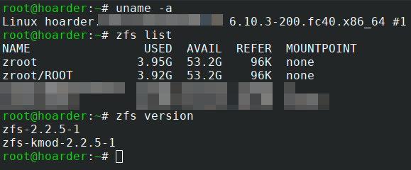 Fedora Server 40 with a ZFS root on the latest Kernel 6.10 (and ZFS 2.2.5) works super nice!
